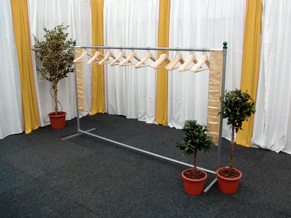 Garderobe Die Garderobenständer sind hochwertig verarbeitet und mit einer Pulverbeschichtung in Aluminiumoptik versehen. Ihre Eckpunkte sind zusätzlich mit Kunststoffkappen verkleidet und sie bieten ausreichend Platz für Kleiderbügel in diversen Farben. Dank der leichten Konstruktion sind sowohl Auf- als auch Umstellung kein Problem. Ausmessungen: Länge: 2,54 m Höhe: 1,51 m Fußbreite: 70 cm |